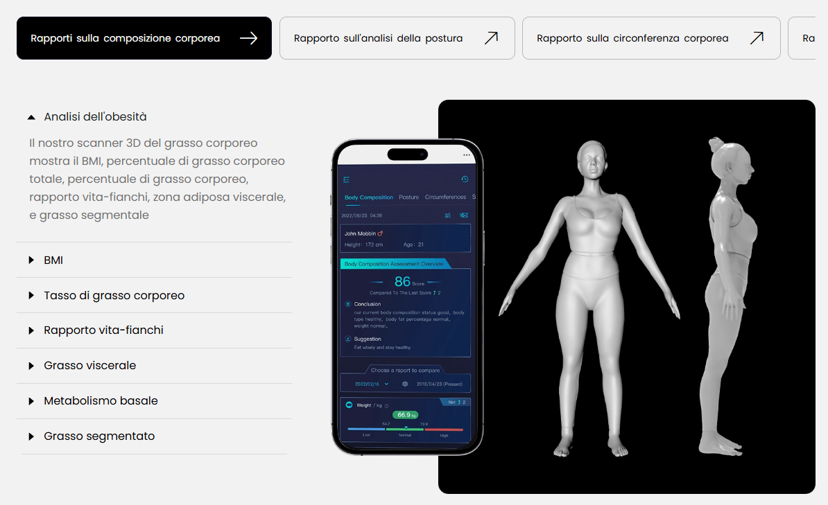 Il Visbody-S 30 combina scansione corporea 3D e analisi dell’impedenza bioelettrica (BIA) per offrire una visione approfondita della composizione corporea. Questo significa che non ci limitiamo a osservare il peso sulla bilancia, ma analizziamo ciò che conta davvero per salute, estetica e performance.