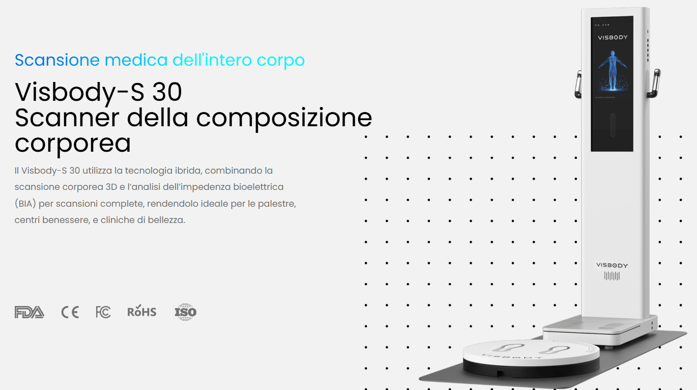 Il Visbody-S 30 è certificato secondo gli standard internazionali FDA, CE, FCC, RoHS e ISO, garantendo sicurezza, precisione e affidabilità. Il suo design moderno e professionale si integra perfettamente con l’ambiente innovativo e scientifico del F-eat Food Lab.